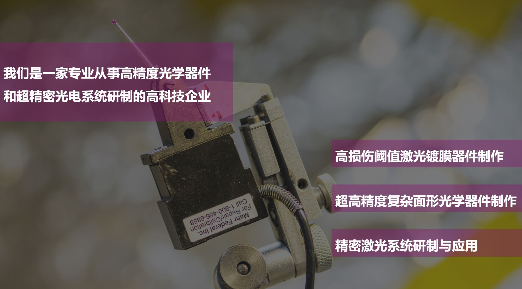 公司構(gòu)建了集高精密光學(xué)器件加工、高性能激光薄膜器件制作、精密光機系統(tǒng)研制于一體的研發(fā)生產(chǎn)平臺,在高損傷閾值激光鍍膜器件制作、超高精度復(fù)雜面形光學(xué)器件制作、精密激光系統(tǒng)研制與應(yīng)用等精密工程光學(xué)領(lǐng)域取得了長足的發(fā)展。公司目前擁有離子束濺射鍍膜機、1800光學(xué)鍍膜機、大尺寸多槽復(fù)合超聲波清洗設(shè)備、高精度電子束蒸發(fā)設(shè)備、大口徑(600mm)光學(xué)干涉儀、納米精度金剛石車削設(shè)備、大面積環(huán)形拋光裝置、激光損傷閾值測試平臺、光學(xué)輪廓儀等60余臺專業(yè)設(shè)備。