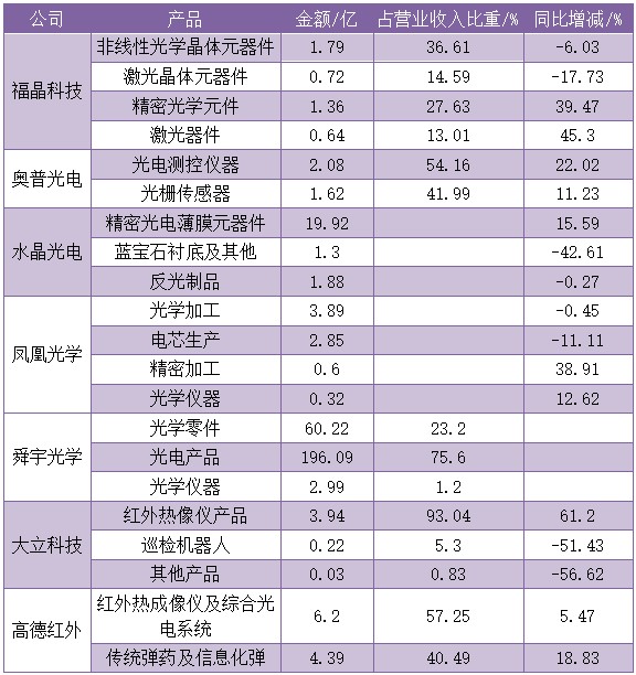 此外,福晶科技在晶體業(yè)務方面,隨著紫外激光器需求的放緩,相關晶體產(chǎn)品的營業(yè)收入比上年下滑。奧普光電在同時面對LED業(yè)務負增長的情況下,積極抓住手機多攝和3D成像等光學新應用的計劃,穩(wěn)固了在手機元器件市場的地位。大立科技與高德紅外的紅外熱像儀產(chǎn)品均為公司主要產(chǎn)品,尤其是大立科技該產(chǎn)品占營業(yè)收入比重為93.04%。兩家公司都在推進紅外熱成像技術的民用化。